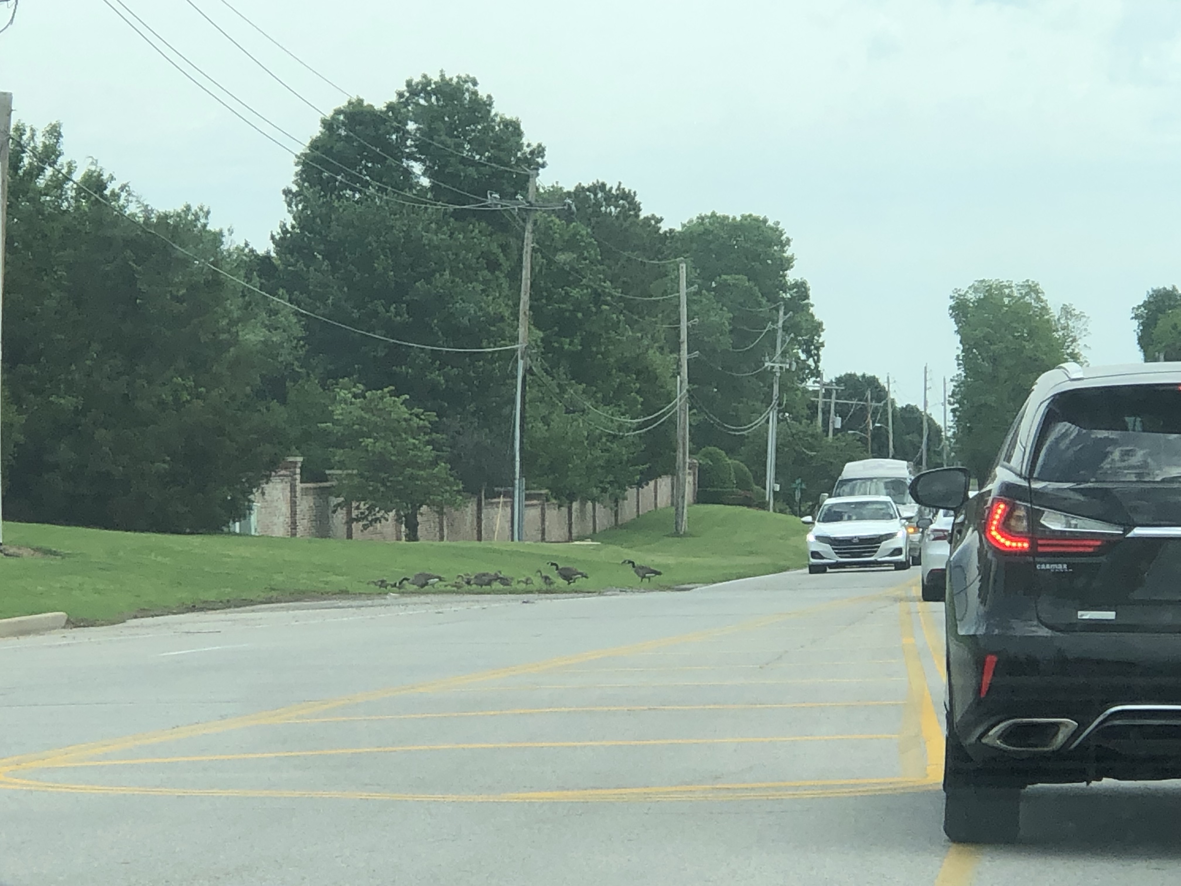 Sunday, just after lunch on our way home, traffic was stopped and we were wondering why. Up ahead, we caught a glimpse of that why! It was a family of geese crossing the road! It was cute. Looked like maybe two family of geese since there were four grown sized geese with all the small goslings.