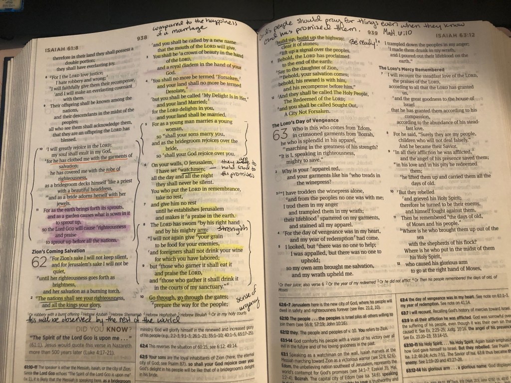 My other example is when I was working on a devotional reading in Isaiah and had to flip to chapter 62, the below were my notes. At the top right (page 939 of my Bible) I had a note that reads “God’s people should pray for things even when they know God has promised them.” with a reference forward to Matthew 6:10 – the Lord’s Prayer. I had also been battling prayer and promises in a lowkey way… I know God keeps His promises, but waiting is what’s hard for us – especially nowadays when things are so snapping quick. We want things yesterday. This was also a flashback to the sermon from last Sunday when my pastor said something similar to this – that if we wait just a little longer, sometimes we’re ready to give up right before He delivers on His promises. Sometimes giving up doesn’t mean we stop believing God or stop doing our Christian things, but giving up on His promises may mean we stop hoping for them, stop praying about them. God still wants us to come to Him – whether it’s with our doubts and questions or with hope and praise.